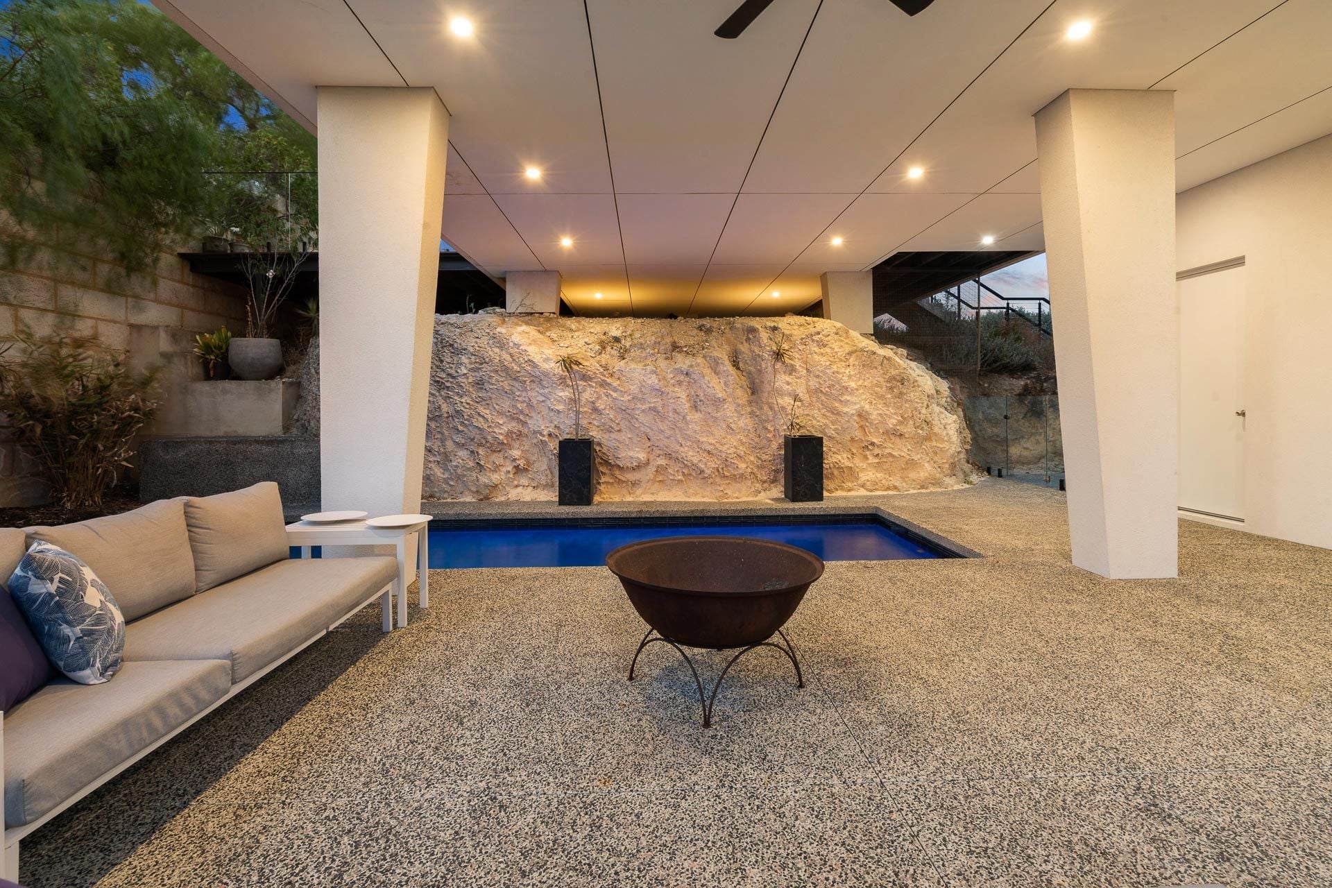 Drive through the electric gate and in to the double garage where beyond an 'oasis' awaits, with a solar-heated pool nestled below natural limestone rock wall. An inviting alfresco area, featuring a Ziegler and Brown Turbo Elite five-burner barbecue, provides an important centrepoint to your entertaining options.